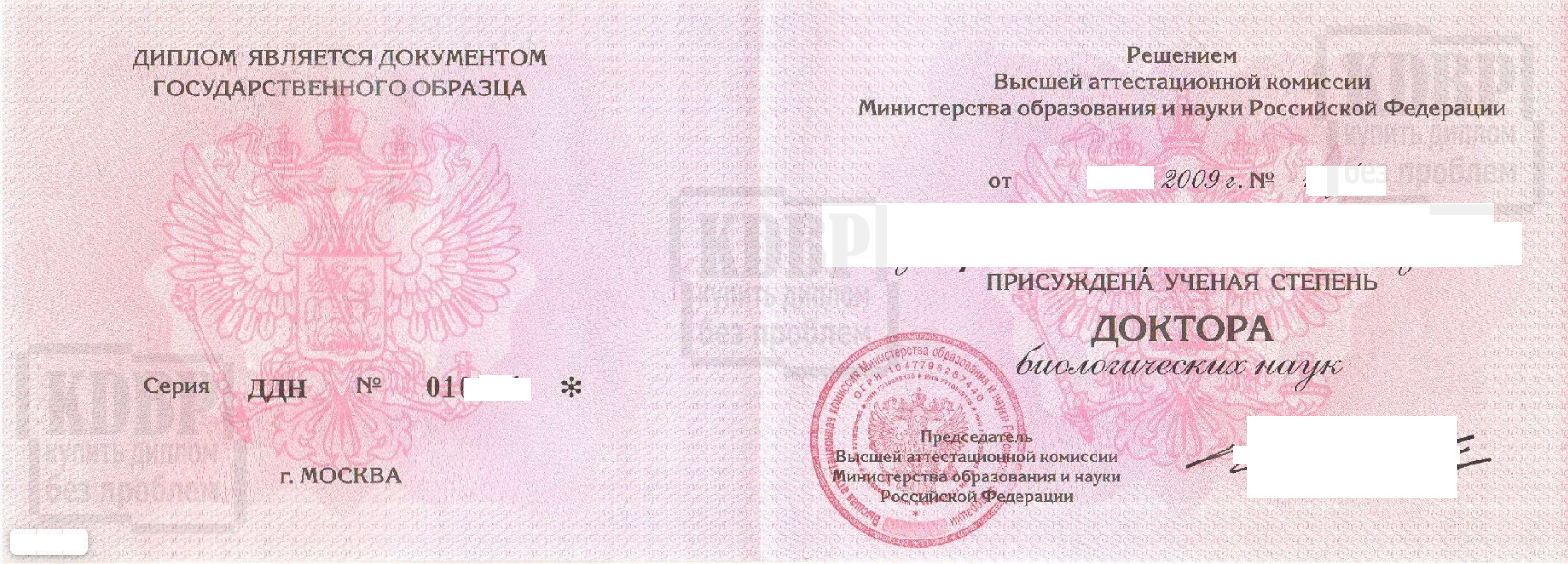Как видите из картинок выше — вроде 2 диплом доктора наук. Но сделаны на разных бланках и выданы разными комиссиями. Но у нас есть большой опыт в изготовлении таких документов и мы сделаем его так, как положено. Никаких проблем потом при его предоставлении не будет. Чтобы заказать диплом — заполните заявку и мы перезвоним вам.